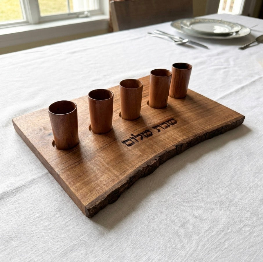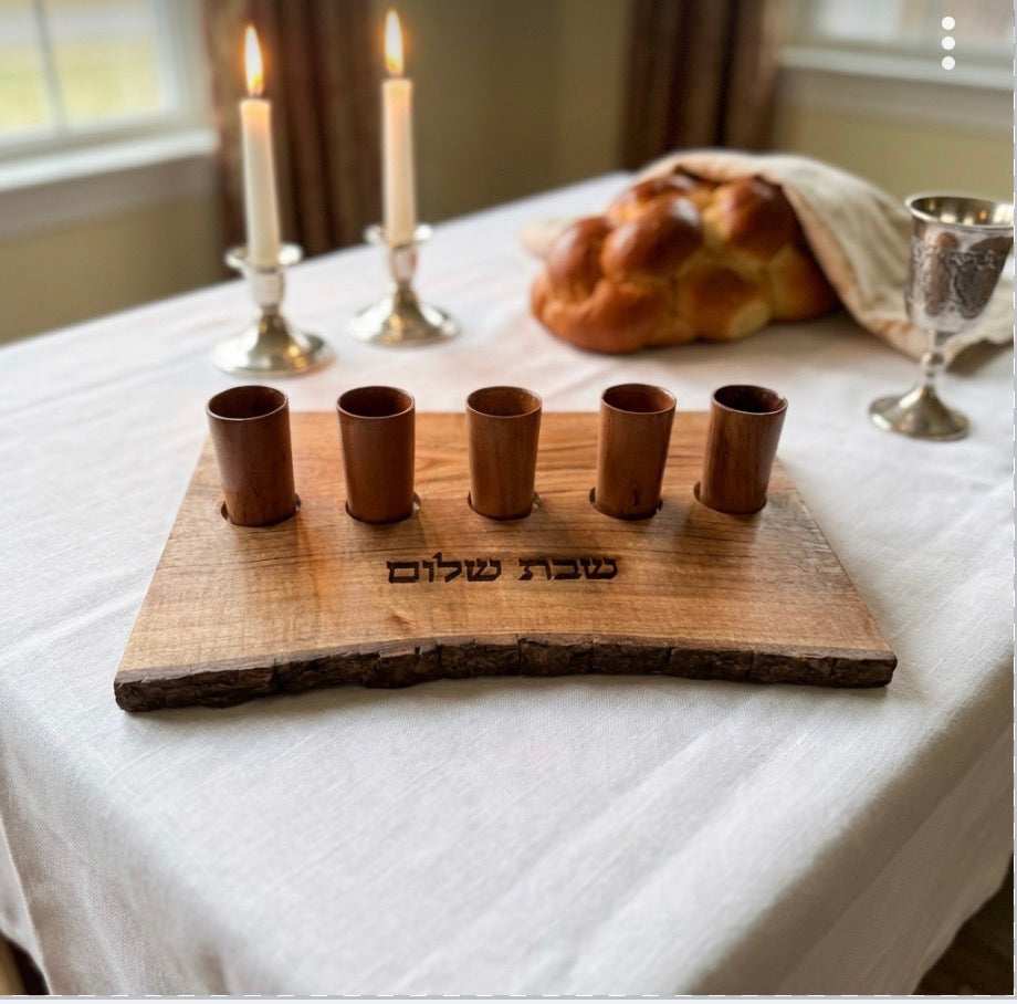 Made from solid natural hardwood with a live edge finish, this piece includes five matching wooden cups set into a beautifully finished wood base engraved with “שבת שלום”.